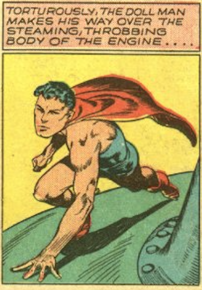 Some credit here; the shift into Doll Man mode, through inexplicable, is not gratuitous. A locomotive offers too little purchase for an ordinary man trying to climb aboard, but there's plenty of room for Doll Man.